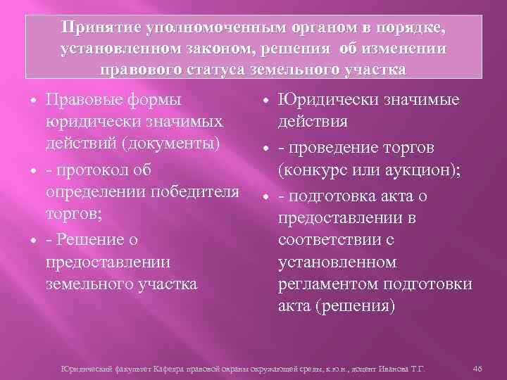Принятие уполномоченным органом в порядке, установленном законом, решения об изменении правового статуса земельного участка Правовые формы юридически значимых действий (документы) - протокол об определении победителя торгов; - Решение о предоставлении земельного участка Юридически значимые действия - проведение торгов (конкурс или аукцион); - подготовка акта о предоставлении в соответствии с установленном регламентом подготовки акта (решения) Юридический факультет Кафедра правовой охраны окружающей среды, к. ю. н. , доцент Иванова Т. Г. 46