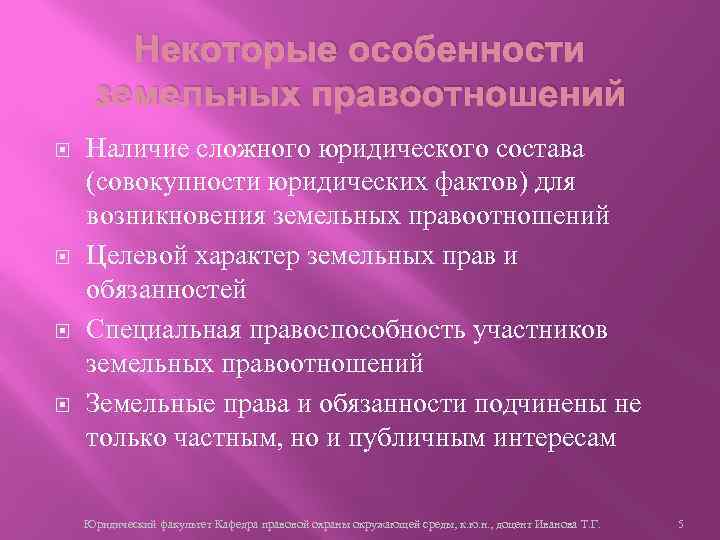 Некоторые особенности земельных правоотношений Наличие сложного юридического состава (совокупности юридических фактов) для возникновения земельных правоотношений Целевой характер земельных прав и обязанностей Специальная правоспособность участников земельных правоотношений Земельные права и обязанности подчинены не только частным, но и публичным интересам Юридический факультет Кафедра правовой охраны окружающей среды, к. ю. н. , доцент Иванова Т. Г. 5