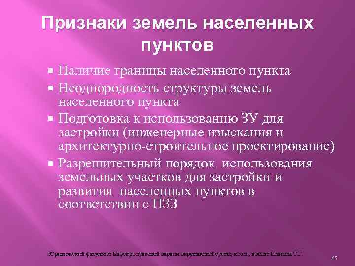Признаки земель населенных пунктов Наличие границы населенного пункта Неоднородность структуры земель населенного пункта Подготовка к использованию ЗУ для застройки (инженерные изыскания и архитектурно-строительное проектирование) Разрешительный порядок использования земельных участков для застройки и развития населенных пунктов в соответствии с ПЗЗ Юридический факультет Кафедра правовой охраны окружающей среды, к. ю. н. , доцент Иванова Т. Г. 65