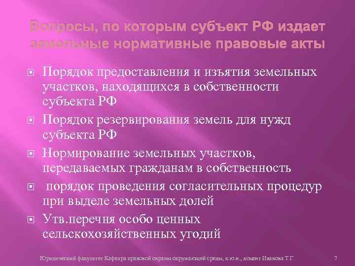 Некоторые особенности земельно-правовых норм Запреты, дозволения, позитивные обязывания Процессуальные правонаделительные нормы, регулирующие деятельность специально уполномоченных исполнительных органов гос. власти и ОМСУ Правоохранительные нормы регулирующие порядок разрешения земельных споров Юридический факультет Кафедра правовой охраны окружающей среды, к. ю. н. , доцент Иванова Т. Г. 6