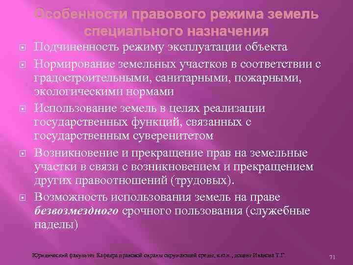 Особенности правового режима земель специального назначения Подчиненность режиму эксплуатации объекта Нормирование земельных участков в соответствии с градостроительными, санитарными, пожарными, экологическими нормами Использование земель в целях реализации государственных функций, связанных с государственным суверенитетом Возникновение и прекращение прав на земельные участки в связи с возникновением и прекращением других правоотношений (трудовых). Возможность использования земель на праве безвозмездного срочного пользования (служебные наделы) Юридический факультет Кафедра правовой охраны окружающей среды, к. ю. н. , доцент Иванова Т. Г. 71