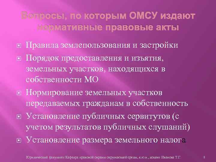 Вопросы, по которым субъект РФ издает земельные нормативные правовые акты Порядок предоставления и изъятия земельных участков, находящихся в собственности субъекта РФ Порядок резервирования земель для нужд субъекта РФ Нормирование земельных участков, передаваемых гражданам в собственность порядок проведения согласительных процедур при выделе земельных долей Утв. перечня особо ценных сельскохозяйственных угодий Юридический факультет Кафедра правовой охраны окружающей среды, к. ю. н. , доцент Иванова Т. Г. 7