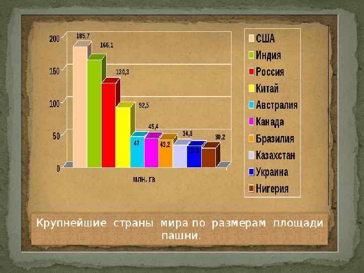 Мировой показатель обеспеченности сельскохозяйственными землями на душу населения составляет — 0, 23 га. В разных странах этот показатель существенно отличается. В Австралии он составляет — 2, 45 га, Канаде — 1, 48 га, Украине - 1, 07 га, России — 0, 9 га. В Китае, Бангладеш и Бельгии на каждого жителя приходится 0, 07 га, в Египте — 0, 05 га, в Японии — 0, 03 га