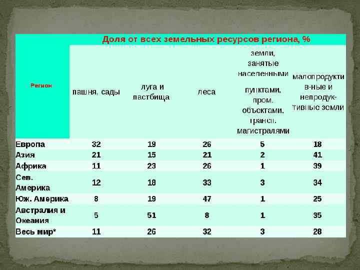 Если весь земельный фонд (13 400 млн га) принять за 100%, то наибольшая доля (25%) будет приходиться на Азию, а наименьшая (6%) — на Австралию и Океанию. Наибольшая доля пастбищ приходится на Африку (24%). Пахотные земли (11% земельного фонда) дают 88% продуктов питания. Пастбища и луга, занимающие 26% земельного фонда, дают еще 10% продуктов
