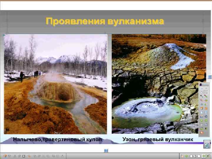 Активные действующие вулканы: Ключевская Сопка и Авачинская Сопка (Камчатка, Российская Федерация), Везувий (Италия), Исалько Побочное извержение вулкана Ключевская сопка. Камчатка. (Сальвадор), Мауна-Лоа (Гавайские о-ва) и др. Один из действующих вулканов Камчатки.