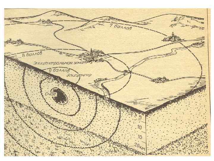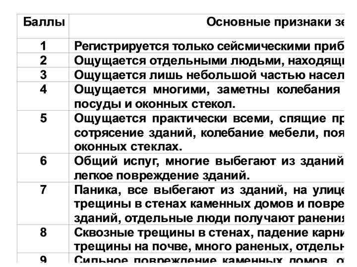 Для измерения силы землетрясения сейсмологи пользуются шкалой Рихтера. Цифры на этой шкале обозначают коли- чество энергии, высвободившейся в очаге землетрясения. Определяют ее по амплитуде смещения частиц почвы. Этот параметр называется магнитудой (М): М= lg [A/(A. Aэ)], где А – максимальная амплитуда смещения частиц почвы на удалении от эпицентра в 100 км; Аэ – эталонная амплитуда слабого землетрясения. Ученые также определяют и интенсивность землетрясения. Это величина сотрясения поверхности Земли в различных местах. В нашей стране с 1964 г. используется 12 -балльная шкала MSK 64, составленная С. В. Медведевым, В. Шпонхойером и В. Карницким. Зарубежом пользуются аналогичной шкалой Меркалли. Интенсивность землетрясения выражается римскими цифрами определяется по свидетельствам очевидцев о силе толчков и по разрушениям в различных точках земной поверхности. При землетрясениях в 11 -12 баллов значения магнитуд составляют 8 -9.