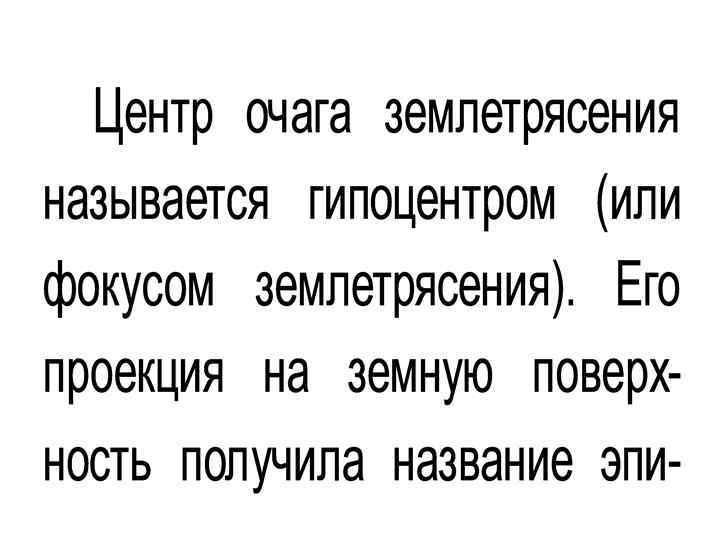 Землетрясения Это резкие перемещения блоков пород внутри литосферы, вызванные скачкообразным освобождением потенциальной энергии упругих напряжений. Освобождение энергии сопровождается разрывом и смещением твердого вещества в очаге землетрясения и деформацией горных пород за пределами очага, которые распространяются в виде упругих колебаний. (сейсмических волн), во всех направлениях