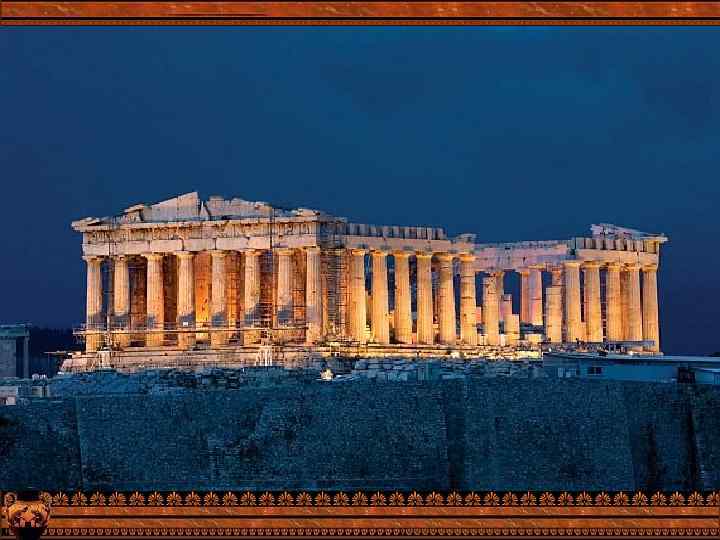 Древние греки построили великолепные памятники архитектуры, и среди них первое место принадлежит Парфенону – главному храму Древних Афин, расположенному на афинском Акрополе, который представляет собой 156 метровый скалистый холм с пологой вершиной (300 м в длину и 170 м в Строительство Парфенона связано с драматическими ширину). Акрополь являлся страницами истории Древней Эллады. В 480 г. до н. э. армия центром социальной и персов во главе с царем Ксерксом вторглась в Грецию. Путь общественной жизни афинян. персов у Фермопильского ущелья преградили 300 Первые здания на Акрополе (два спартанских воинов, прикрывавших отход основных войск. В храма в честь богини Афины) результате предательства все они пали, и персидская армия сооружены в 1050 - 700 годах до захватила и разгромила Афины. После окончания греко-персидских войн, в эпоху н. э. Именно на этом месте в правления Перикла было решено возвести новый, более эпоху Перикла величественный и роскошный храм. В строительстве воздвигнут Парфенона принимал участие весь народ Древней Эллады, со всей Греции в Афины доставляли белый мрамор, медь, слоновую кость, золото, черное дерево, кипарис.