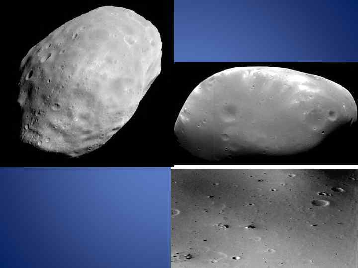 • Супутники Марса були відкриті в 1877 році американським астрономом Асафом Голлом, і названі на честь давньогрецьких міфологічних богів Фобоса та Деймоса, які уособлювали страх і жах, з огляду на їх незвичну форму. • Обидва супутника обертаються навколо своїх осей з тим же періодом, що й навколо Марса, тому завжди повернуті до планети однією й тією же стороною. Приливна дія Марса поступово сповільнює рух Фобоса, що врештірешт призведе до падіння супутника на Марс. Деймос, навпаки, віддаляється від Марса.