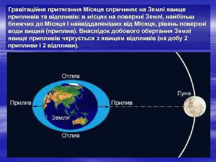 Гравітаційне притягання Місяця спричиняє на Землі явище припливів та відпливів: в місцях на поверхні Землі, найбільш ближчих до Місяця і найвіддаленіших від Місяця, рівень поверхні води вищий (приплив). Внаслідок добового обертання Землі явище припливів чергується з явищем відпливів (на добу 2 припливи і 2 відпливи).