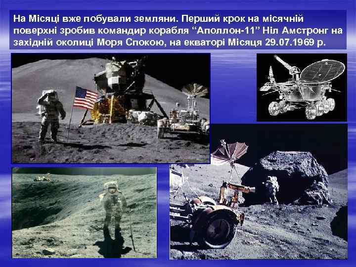 На Місяці вже побували земляни. Перший крок на місячній поверхні зробив командир корабля “Аполлон-11” Ніл Амстронг на західній околиці Моря Спокою, на екваторі Місяця 29. 07. 1969 р.