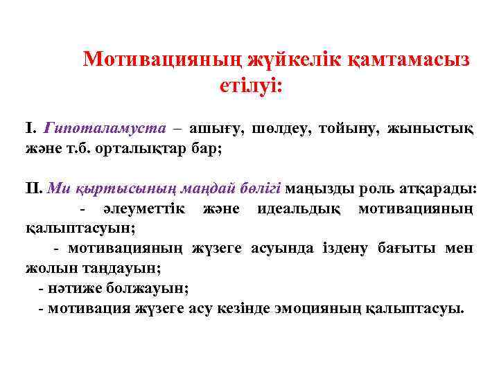 Мотивацияның жүйкелік қамтамасыз етілуі: І. Гипоталамуста – ашығу, шөлдеу, тойыну, жыныстық және т. б. орталықтар бар; ІІ. Ми қыртысының маңдай бөлігі маңызды роль атқарады: - әлеуметтік және идеальдық мотивацияның қалыптасуын; - мотивацияның жүзеге асуында іздену бағыты мен жолын таңдауын; - нәтиже болжауын; - мотивация жүзеге асу кезінде эмоцияның қалыптасуы.