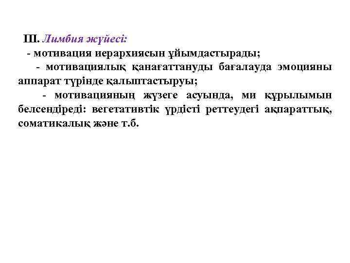 ІІІ. Лимбия жүйесі: - мотивация иерархиясын ұйымдастырады; - мотивациялық қанағаттануды бағалауда эмоцияны аппарат түрінде қалыптастыруы; - мотивацияның жүзеге асуында, ми құрылымын белсендіреді: вегетативтік үрдісті реттеудегі ақпараттық, соматикалық және т. б.