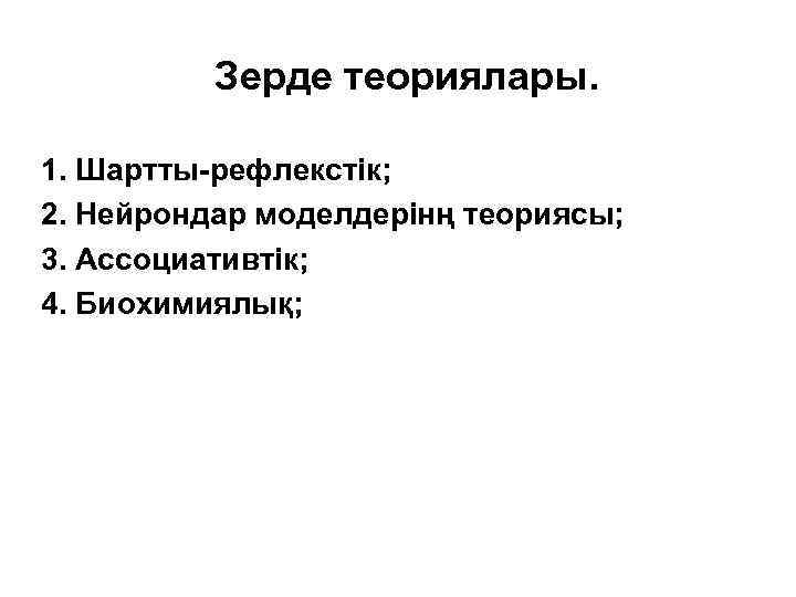 Зерде теориялары. 1. Шартты-рефлекстік; 2. Нейрондар моделдерінң теориясы; 3. Ассоциативтік; 4. Биохимиялық;