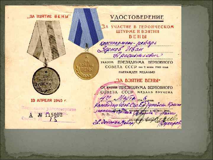 Мой прадедушка Зернов Иван Арсеньевич родился в 1919 году, в 1939 году его забрали в армию, а в 1941 году началась Великая Отечественная война, и он с первых дней попал на фронт. Он начал войну рядовым пехотинцем, а закончил старшим сержантом в Берлине. Прадедушка был причислен к 46 армии 2 -го Украинского фронта, 40 -ой Гвардейской Стрелковой Енакиевской Краснознаменной Дивизии, 31 Гвардейского Стрелкового Корпуса. Награжден орденами и медалями, был в окружении под Сталинградом, принимал участие в боях за Польшу, Вену, Варшаву, Будапешт, форсировал реку Дунай, реку Раба.