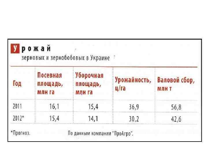 Место Украины в Европе и мире по объемам выращивания некоторых сельскохозяйственных культур № 1 2 3 4 5 6 7 8 9 10 Место в мире по объемам выращивания Место в Европе по объемам выращивания 1 1 Ячмень Картофель Сахарная свекла 3 4 3 2 6 4 Капуста Морковь Рапс Кукуруза Пшеница Яблоки 6 7 9 10 11 2 4 5 2 4 12 4 Культура Подсолнечник