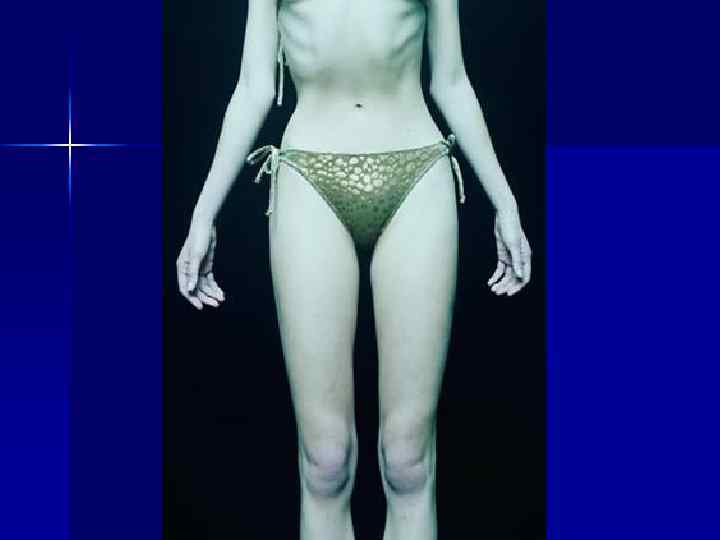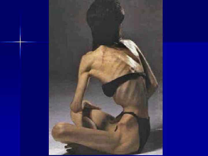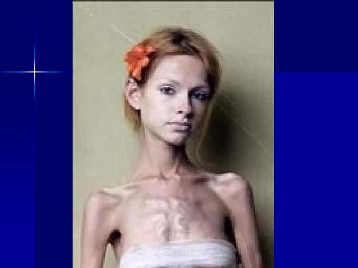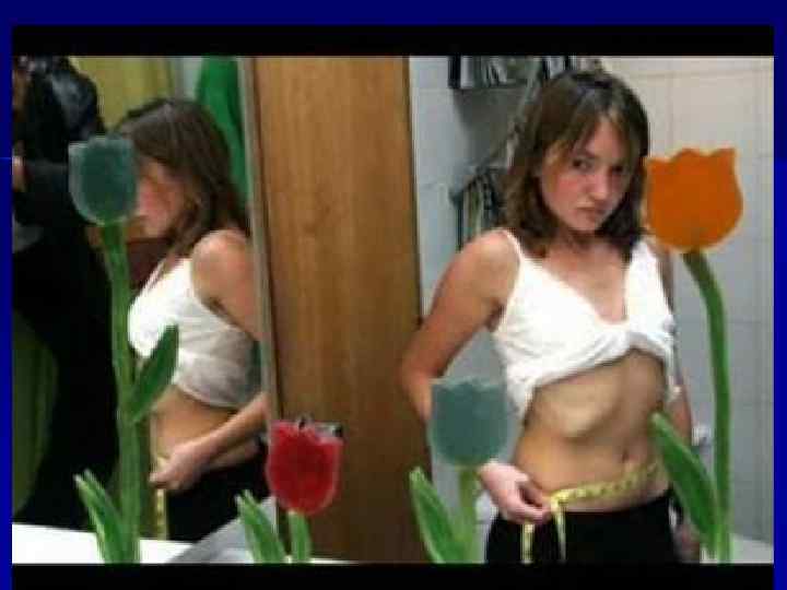 Анорексияның негізгі белгілері ü ü ü ü Прогрессирленген салмақты жоғалту, жазылуға деген паникалық қорқыныш Үнемі өзіндегі толықтықты ссезу, көбінде кейбір дене бөліктеріндегі Тамақтану әдістері: тұрып тамақтану, тамақты өте ұсақ бөліктерге- бөліп тамақтану Ұйқының бұзылуы, Тамақтанған кезде және ашыққан кезде өзін- өзі кінәлау депрессия. Қоршаған ортадан оңашалану