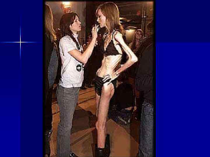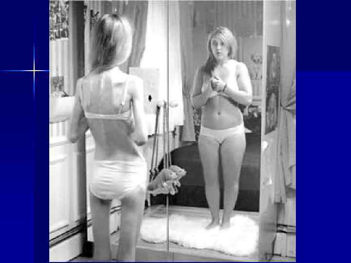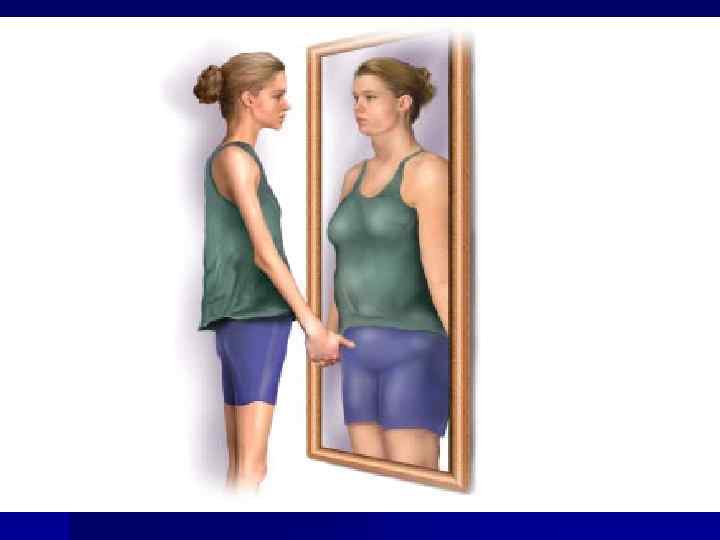 Жүйкелік анорексияның психикалық себептері 1) 2) 3) 4) 5) Пластикалық хирургия, косметалогия, диетология, мода, бұл көріністер адамады денесінен бөлектейді Өзінің денесіне және кейбір бөліктеріне қанағаттанбау: салмағы, бойы, сыртқы келбеті. Өз ойындағы идеалға сәйкес келмеу. Жалпы қабылданған стандартқа сәйкес келмеу қорқынышы. Ағза үшін қоректің көзі ретінде тамақ қабылдауды бағаламау