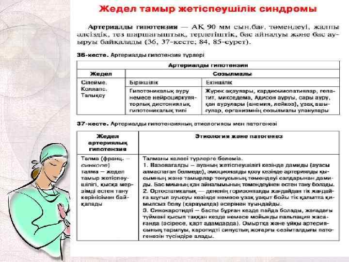 Артериалды гипотензия синдромы I. Біріншік II. Екіншілік : 1. Эндокринды ауруларда А. бүйрекүстілік жетіспеушілікте Б. Гипотиреоз В. Гипопитуитаризм 2. бүйрек ауруларында 3. жүрек туа пайда болған ақауларында Екіншілік АГ: Жедел (ШОК, СН) 2. Созылмалы 3. дәрілік затқа жағымсыз әсер ретінде