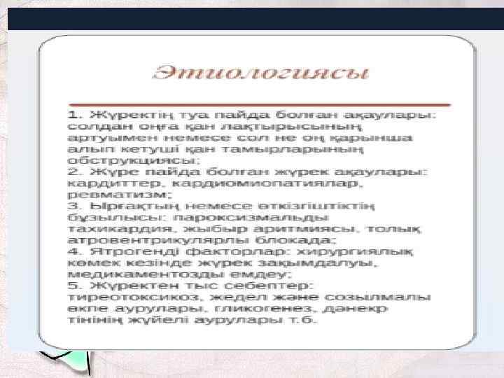 Этиологиялық фактор Жүрек өткізгіштігінің бұзылысы Жүрек автоматизмінің бұзылысы Жүрек қозғыштығының бұзылысы Жүректік аритмиялар