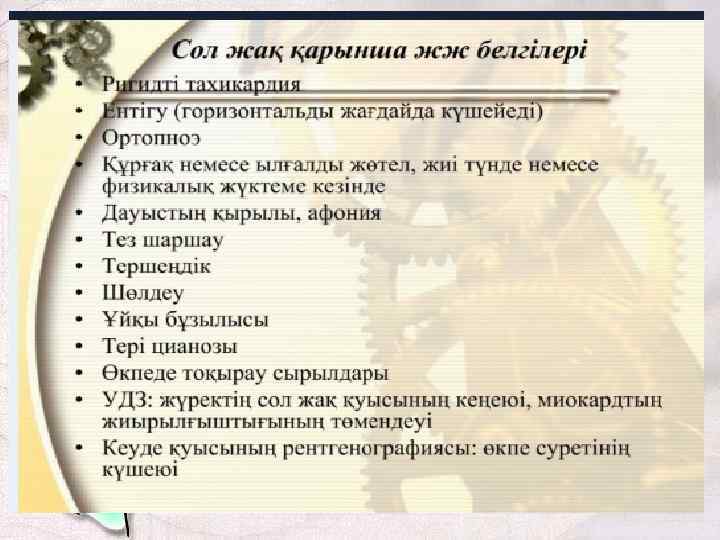 Жүрек ақауы синдромы Митралды стеноз 1. пульс малый, может быть неодинаковый на правой и левой руках (pulsus differens) 2. верхушечный толчок ограниченный, определяется диастолическое «кошачье мурлыканье» 3. смещение границ сердца вправо и вверх, на верхушке I тон хлопающий, после II тона 4. добавочный тон открытия митрального клапана (ритм перепела) 5. диастолические (пресистолический, протодиастолический) шумы, акцент и может быть раздвоение II тона над легочной артерией;