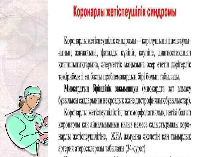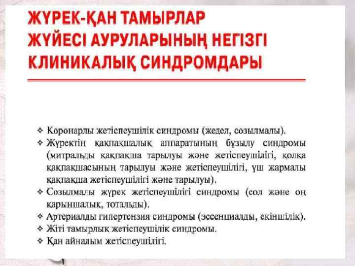ЖҚЖ зақымдануы кезіндегі негізгі клиникалық синдромдар : 1. кардиалгияық; 2. аритмиялық; 4. артериалды гипертензия синдромы ; 5. артериальды гипотензия; 6. жүрек жетіспеушілік синдромы 7. Жүрек ақауы сондромы.