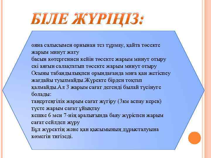 БІЛЕ ЖҮРІҢІЗ: ояна салысымен орнынан тез тұрмау, қайта төсекте жарым минут жату басын көтергеннен кейін төсекте жарым минут отыру екі аяғын салақтатып төсекте жарым минут отыру Осыны табандылықпен орындағанда миға қан жетіспеу жағдайы туылмайды. Жүректе бірден тоқтап қалмайды. Ал 3 жарым сағат дегенді былай түсінуге болады: таңертеңгілік жарым сағат жүгіру (3 км аспау керек) түсте жарым сағат ұйықтау кешке 6 мен 7 нің аралығында баяу жүріспен жарым сағат сейлдеп жүру Бұл жүректің және қан қысымының дұрысталуына көмегін тигізеді.
