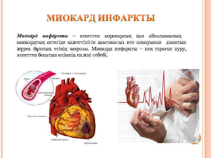 Миокард инфаркты – кенеттен коронарлық қан айналымының миокардтың оттегіде қажеттілігін қамтамасыз өте алмауынан дамитын жүрек бұлшық етінің некрозы. Миокард инфаркты – кең тараған ауру, кенеттен болатын өлімнің ең жиі себебі.