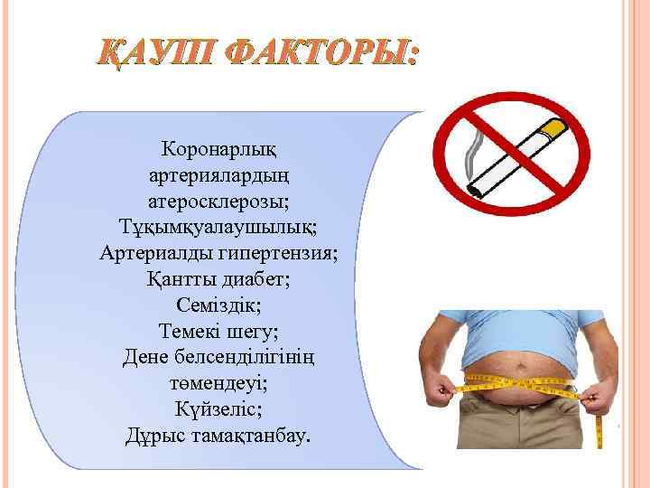 ҚАУІП ФАКТОРЫ: Коронарлық артериялардың атеросклерозы; Тұқымқуалаушылық; Артериалды гипертензия; Қантты диабет; Семіздік; Темекі шегу; Дене белсенділігінің төмендеуі; Күйзеліс; Дұрыс тамақтанбау.
