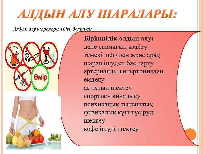 АЛДЫН АЛУ ШАРАЛАРЫ: Алдын алу шаралары екіге бөлінеді: Біріншілік алдын алу: дене салмағын азайту темекі шегуден және арақ шарап ішуден бас тарту артериалды гипертониядан емделу ас тұзын шектеу спортпен айналысу психикалық тыныштық физикалық күш түсіруді шектеу кофе ішуді шектеу