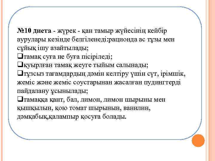 № 10 диета жүрек қан тамыр жүйесінің кейбір аурулары кезінде белгіленеді: рационда ас тұзы мен сұйық ішу азайтылады; qтамақ суға не буға пісіріледі; qқуырлған тамақ жеуге тыйым салынады; qтұзсыз тағамдардың дәмін келтіру үшін сүт, ірімшік, жеміс және жеміс соустарынан жасалған пудингтерді пайдалану ұсынылады; qтамаққа қант, бал, лимон шырыны мен қышқылын, қою томат шырынын, ванилин, дәмқабық, қалампыр қосуға болады.