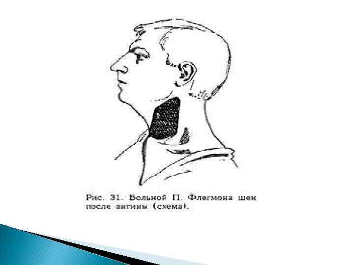 Парафарингиальді абсцесс Парафарингиальді кеңістіктің іріңдігі. Тамақ тұсынан күрт бір жақты ауырсыну Шайнау бұлшықетінің тризмі Науқас басы ауырған жаққа бағытталады Мойынның қаптал беткейін пальпациялағанда ауырсыну