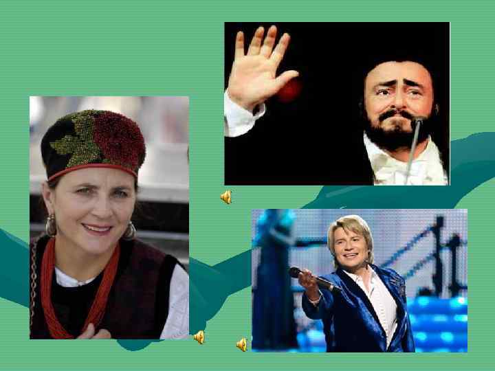 Федір Шаляпін (бас) Соломія Крушельницька ( сопрано) Микола Басков ( тенор) Дмитро Гнатюк ( баритон)