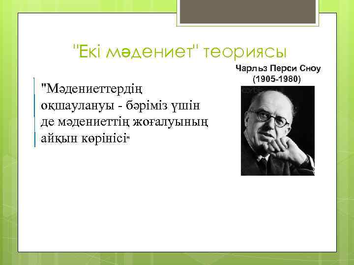 "Екі мәдениет" теориясы "Мәдениеттердің оқшаулануы - бәріміз үшін де мәдениеттің жоғалуының айқын көрінісі" Чарльз Перси Сноу (1905 -1980)