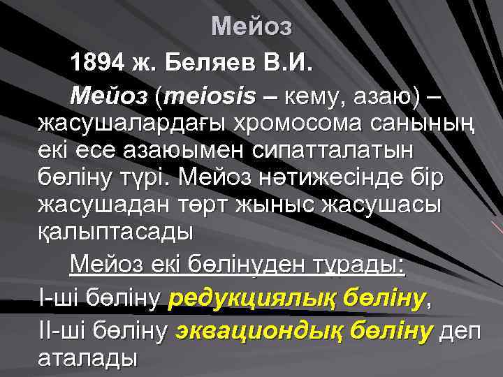 Мейоз 1894 ж. Беляев В. И. Мейоз (meiosis – кему, азаю) – жасушалардағы хромосома санының екі есе азаюымен сипатталатын бөліну түрі. Мейоз нәтижесінде бір жасушадан төрт жыныс жасушасы қалыптасады Мейоз екі бөлінуден тұрады: І-ші бөліну редукциялық бөліну, ІІ-ші бөліну эквациондық бөліну деп аталады