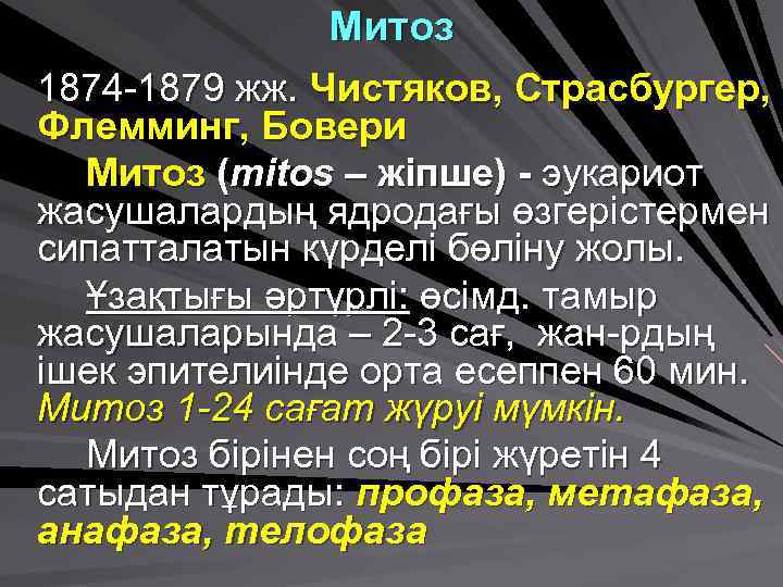 Митоз 1874 -1879 жж. Чистяков, Страсбургер, Флемминг, Бовери Митоз (mitos – жіпше) - эукариот жасушалардың ядродағы өзгерістермен сипатталатын күрделі бөліну жолы. Ұзақтығы әртүрлі: өсімд. тамыр жасушаларында – 2 -3 сағ, жан-рдың ішек эпителиінде орта есеппен 60 мин. Митоз 1 -24 сағат жүруі мүмкін. Митоз бірінен соң бірі жүретін 4 сатыдан тұрады: профаза, метафаза, анафаза, телофаза