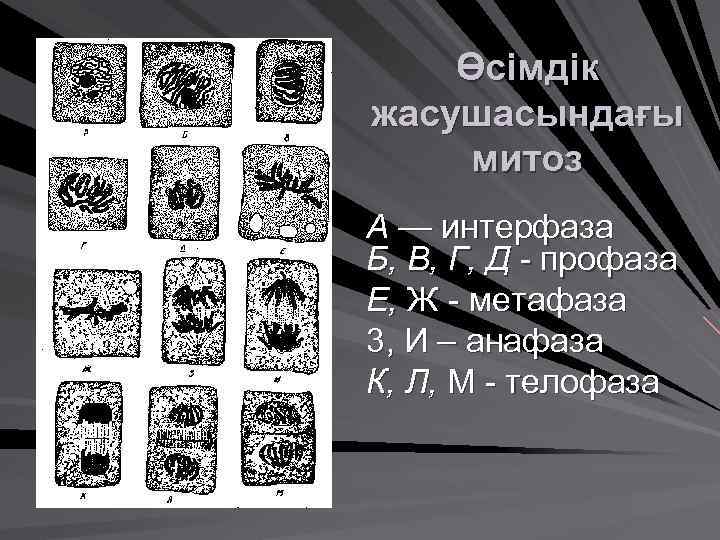 Өсімдік жасушасындағы митоз А — интерфаза Б, В, Г, Д - профаза Е, Ж - метафаза 3, И – анафаза К, Л, М - телофаза