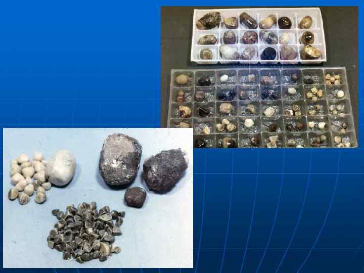 Состав камней n n Холестериновые: овальной формы, твердые, средних размеров, одиночные, поверхность ровная, блестящая с радиарной исчерченностью, слоистой структурой Пигментные: мелкие, хрупкие, гомогенные, на разрезе черного цвета Известковые: причудливой формы с отростками, светло- или темнокоричневого цвета Смешанные – чаще