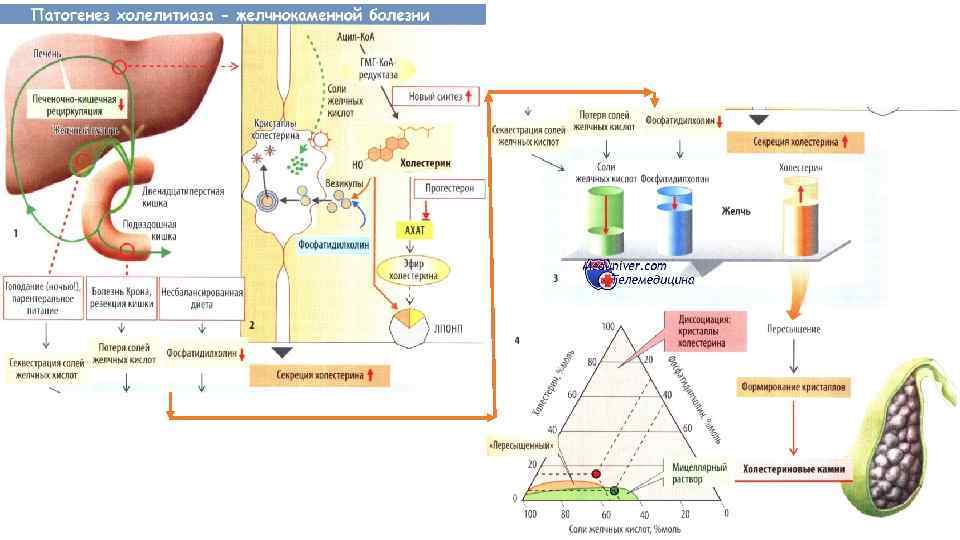 Холестериновые жёлчные камни • При желчнокаменной болезни печень выделяет желчь с повышенным содержанием холестерина, это объясняется либо относительным недостатком жёлчных солей, либо относительным избытком холестерина. Такая жёлчь, перенасыщенная холестерином, называется литогенной*. • Также очень важны факторы, инициирующие кристаллизацию * Факторы, приводящие к продукции литогенной желчи холестерина в литогенной жёлчи. • Нарушение синтеза жёлчных солей жк • • Повышенная потеря жёлчных солей в кишечнике Гиперчувствительная обратная связь на жёлчные соли Повышенная секреция холестерина Нарушение функции жёлчного пузыря