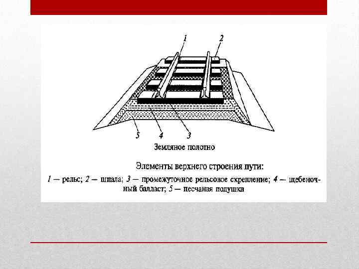 • Верхнее строение пути - Все элементы верхнего строения пути (ВСП) в целом образуют единую конструкцию, предназначенную для непосредственного восприятия воздействия колёс подвижного состава и передачи этого воздействия на нижнее строение пути. Рельсы и стрелочные переводы, кроме того, обеспечивают соответствующие направление движения • подвижного состава. Все элементы верхнего строения пути взаимосвязаны, так как работа каждого элемента связана с состоянием и положением других элементов. На верхнее строение действуют следующие силы: • • вертикальные силы от колёс подвижного состава; боковые силы от колёс подвижного состава при повороте его в кривых и при вилянии (поперечном смещении в колее на прямых); продольные силы от колёс вагонов, а также от торможения; продольные сжимающие или растягивающие силы, возникающие при изменении температуры по сравнению с той, при которой укладывались и закреплялись рельсы. • •