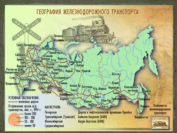 География российских железных дорог География железных дорог в европейкой и азиатской частях страны отличаются. Дороги европейской части имеют радиально-кольцевую структуру. Ее центр. Москва, от которой в разные стороны расходятся 11 железнодорожных радиусов. Кольцевые железные дороги построены на расстоянии примерно 100 и 300 км от Москвы. Главная проблема такой сети дорогоперегруженность ее центральной части и снижение густоты дорог на окраинах. В азиатской части страны дороги в основном широтного направления. Они проходят по ее южной части. Значение этих дорог для страны велико, что они имеют собственные названия.
