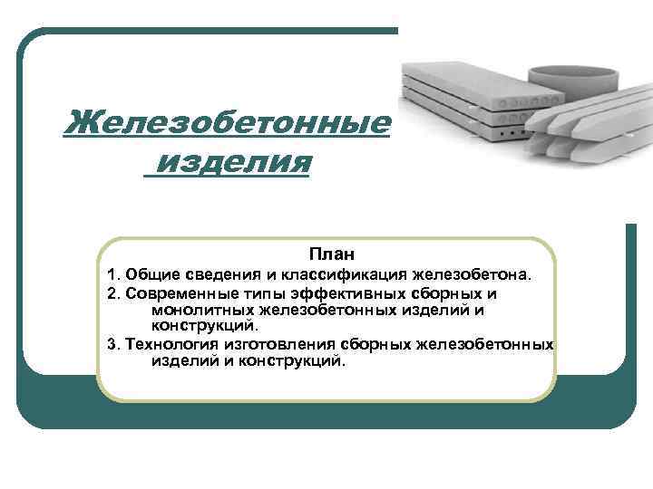 Железобетонные изделия План 1. Общие сведения и классификация железобетона. 2. Современные типы эффективных сборных и монолитных железобетонных изделий и конструкций. 3. Технология изготовления сборных железобетонных изделий и конструкций.