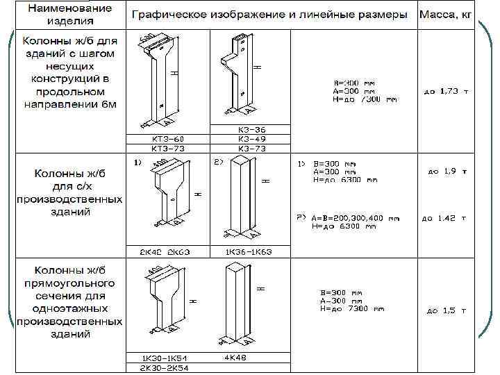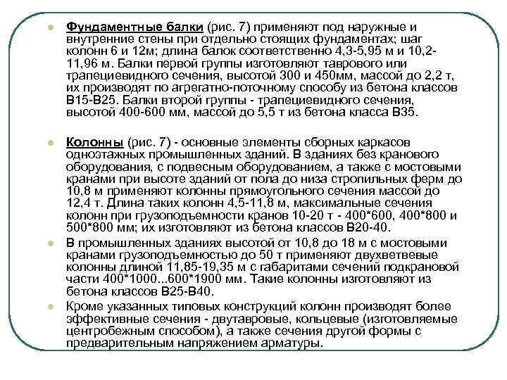 l Фундаментные балки (рис. 7) применяют под наружные и внутренние стены при отдельно стоящих фундаментах; шаг колонн 6 и 12 м; длина балок соответственно 4, 3 -5, 95 м и 10, 211, 96 м. Балки первой группы изготовляют таврового или трапециевидного сечения, высотой 300 и 450 мм, массой до 2, 2 т, их производят по агрегатно-поточному способу из бетона классов В 15 -В 25. Балки второй группы - трапециевидного сечения, высотой 400 -600 мм, массой до 5, 5 т из бетона класса В 35. l Колонны (рис. 7) - основные элементы сборных каркасов одноэтажных промышленных зданий. В зданиях без кранового оборудования, с подвесным оборудованием, а также с мостовыми кранами при высоте зданий от пола до низа стропильных ферм до 10, 8 м применяют колонны прямоугольного сечения массой до 12, 4 т. Длина таких колонн 4, 5 -11, 8 м, максимальные сечения колонн при грузоподъемности кранов 10 -20 т - 400*600, 400*800 и 500*800 мм; их изготовляют из бетона классов В 20 -40. В промышленных зданиях высотой от 10, 8 до 18 м с мостовыми кранами грузоподъемностью до 50 т применяют двухветвевые колонны длиной 11, 85 -19, 35 м с габаритами сечений подкрановой части 400*1000. . . 600*1900 мм. Такие колонны изготовляют из бетона классов В 25 -В 40. Кроме указанных типовых конструкций колонн производят более эффективные сечения - двутавровые, кольцевые (изготовляемые центробежным способом), а также сечения другой формы с предварительным напряжением арматуры. l l