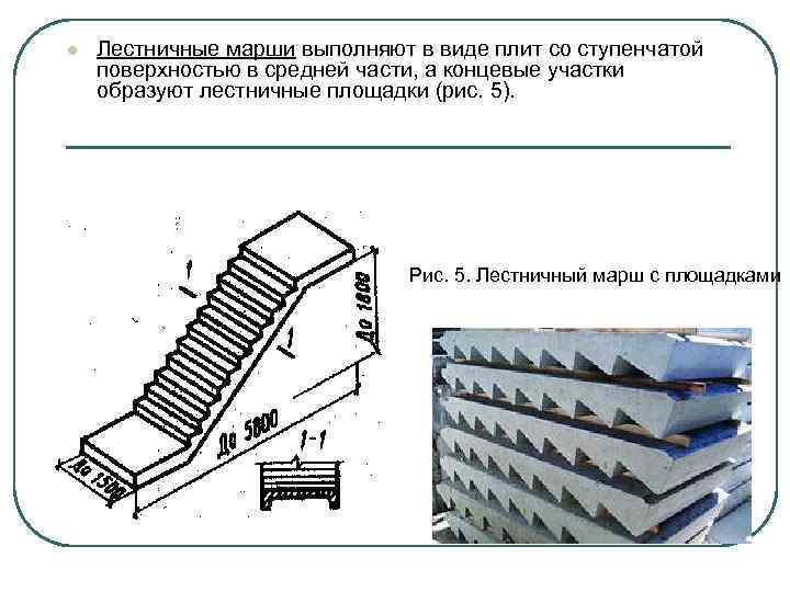 l Лестничные марши выполняют в виде плит со ступенчатой поверхностью в средней части, а концевые участки образуют лестничные площадки (рис. 5). Рис. 5. Лестничный марш с площадками