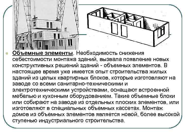 l Объемные элементы. Необходимость снижения себестоимости монтажа зданий, вызвала появление новых конструктивных решений зданий - объемных элементов. В настоящее время уже имеется опыт строительства жилых зданий из целых квартирных блоков, которые изготовляют на заводе со всеми санитарно-техническими и электротехническими устройствами, оснащают встроенной мебелью и кухонным оборудованием. Такие объемные блоки или собирают на заводе из отдельных плоских элементов, или изготовляют в специальных объемных кассетах. Монтаж домов из объемных элементов является новой, более высокой ступенью индустриального строительства.