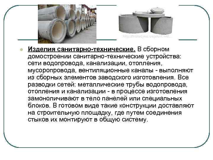 l Изделия санитарно-технические. В сборном домостроении санитарно-технические устройства: сети водопровода, канализации, отопления, мусоропровода, вентиляционные каналы - выполняют из сборных элементов заводского изготовления. Все разводки сетей: металлические трубы водопровода, отопления и канализации - в процессе изготовления замоноличивают в тело панелей или специальных блоков. В готовом виде такие конструкции доставляют на строительную площадку, где путем соединения стыков их монтируют в общую систему.