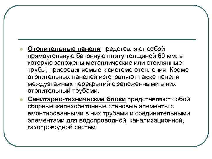 l l Отопительные панели представляют собой прямоугольную бетонную плиту толщиной 60 мм, в которую заложены металлические или стеклянные трубы, присоединяемые к системе отопления. Кроме отопительных панелей изготовляют также панели междуэтажных перекрытий с заложенными в них отопительный трубами. Санитарно-технические блоки представляют собой сборные железобетонные стеновые элементы с вмонтированными в них трубами и соединительными элементами для водопроводной, канализационной, газопроводной систем.