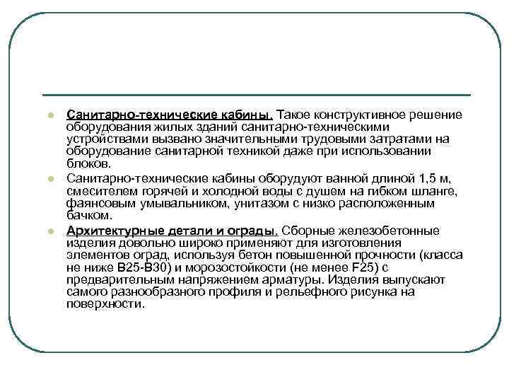 l l l Санитарно-технические кабины. Такое конструктивное решение оборудования жилых зданий санитарно-техническими устройствами вызвано значительными трудовыми затратами на оборудование санитарной техникой даже при использовании блоков. Санитарно-технические кабины оборудуют ванной длиной 1, 5 м, смесителем горячей и холодной воды с душем на гибком шланге, фаянсовым умывальником, унитазом с низко расположенным бачком. Архитектурные детали и ограды. Сборные железобетонные изделия довольно широко применяют для изготовления элементов оград, используя бетон повышенной прочности (класса не ниже В 25 -В 30) и морозостойкости (не менее F 25) с предварительным напряжением арматуры. Изделия выпускают самого разнообразного профиля и рельефного рисунка на поверхности.