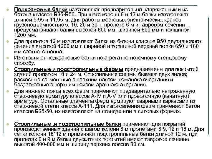 l l l Подкрановые балки изготовляют предварительно напряженными из бетона классов В 35 -В 50. При шаге колонн 6 и 12 м балки изготовляют длиной 5, 95 и 11, 95 м. Для работы мостовых электрических кранов грузоподъемностью 5, 10, 20 и 30 т, пролете 6 м и тавровом сечении предусматривают балки высотой 800 мм, шириной 600 мм и толщиной 1200 мм. Для пролетов 12 м изготовляют балки из бетона классов В 50 двутаврового сечения высотой 1200 мм с шириной и толщиной верхней полки 650 и 160 мм соответственно. Изготовляют подкрановые балки по агрегатно-поточному стендовому способу. Стропильные и подстропильные фермы предназначены для покрытий зданий пролетом 18 и 24 м. Стропильные фермы бывают двух видов; раскосные сегментные с верхним поясом ломаного очертания и безраскосные с верхним поясом арочного очертания. Для нижнего пояса всех ферм применяют предварительно напряженную стержневую арматуру классов A-IV и A-V или проволочную (канатную) арматуру. Остальные элементы ферм армируют сварными каркасами из стержневой стали класса А-111. Для изготовления ферм применяют бетон классов В 35 -50, их изготовляют на стендах или в силовых формах. Стропильные. и подстропильные балки применяют для покрытий производственных зданий с шагом колонн 6 м пролетами 6, 9, 12 и 18 м. Для сетки колонн 18*12 м применяют подстропильные балки длиной 12 м, при пролетах 6 и 9 м балки двускатных покрытий имеют тавровое сечение высотой 400 -800 мм и ширину верхних поясов 30 см.