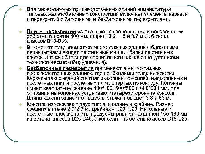 l Для многоэтажных производственных зданий номенклатура типовых железобетонных конструкций включает элементы каркаса и перекрытий с балочными и безбалочными перекрытиями. l Плиты перекрытий изготовляют с продольными и поперечными ребрами высотой 400 мм, шириной 3, 1, 5 и 0, 7 м из бетона классов В 15 -В 35. В номенклатуру элементов многоэтажных зданий с балочными перекрытиями входят лестничные марши, балки лестничных клеток, а также балки для специального назначения (установки технологического оборудования). Безбалочные перекрытия применяют в многоэтажных производственных зданиях, где необходимы гладкие потолки. Каркасы таких зданий состоят из колонн, консолей, надколонных и пролетных плит, опертых по контуру. Колонны имеют квадратное сечение 400*400, 500*500 и 600*600 мм, для опирания на колоннах устраивают четырехсторонние консоли. Длина колонн зависит от высоты этажа и бывает 3, 8 -7, 63 м. Консоли изготовляют двух типов: средние и крайние. Размер средних в плане 2, 7*2, 7 м, крайних - 1, 95*1, 95. Напольные и пролетные плоские плиты предусматривают толщиной 150 -180 мм из бетона классов В 25 -В 40, а консоли - из бетона классов В 15 -В 25. l l l